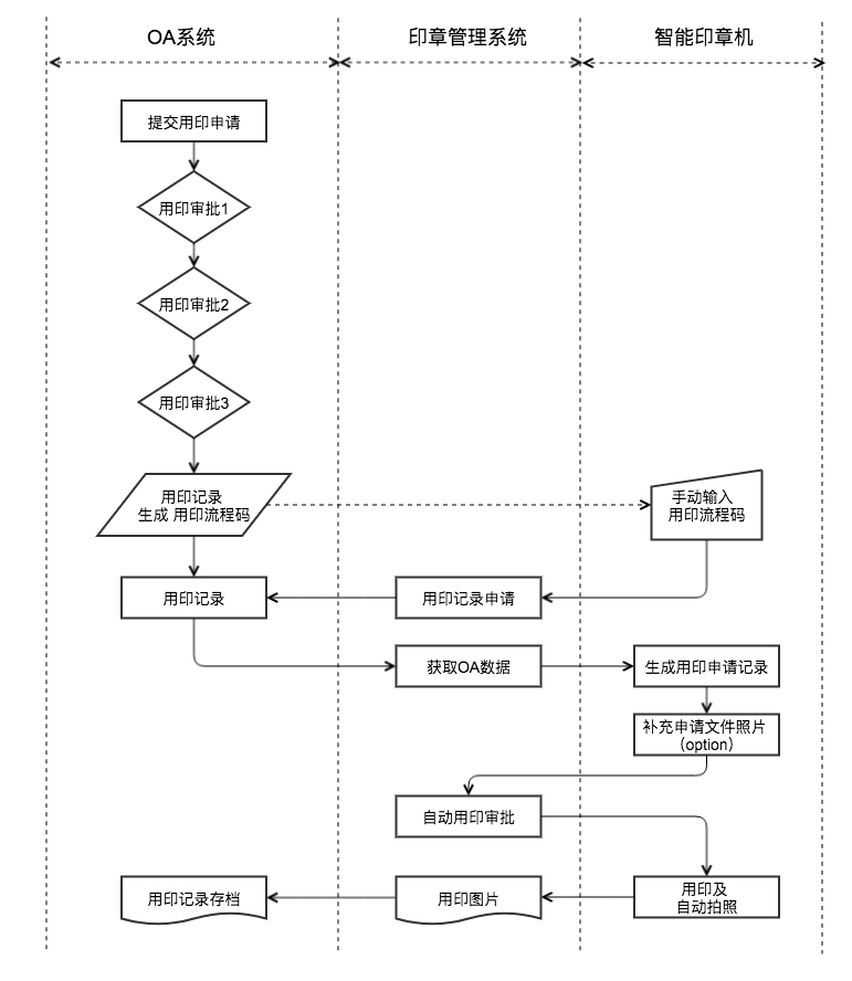 用戶的用印申請(qǐng)和審批流程在OA系統(tǒng)內(nèi)完成,審批通過(guò)后,與印章系統(tǒng)通過(guò)設(shè)定接口在服務(wù)管理后臺(tái)進(jìn)行通訊,將用印申請(qǐng)和審批的詳細(xì)內(nèi)容傳輸?shù)接≌孪到y(tǒng),并發(fā)送到智能印章機(jī)上。用印用戶在智能印章機(jī)上完成用印行為。通過(guò)標(biāo)準(zhǔn)通信接口的方式,智能印章系統(tǒng)和OA系統(tǒng)之間可以實(shí)現(xiàn)完美的對(duì)接,不但可以迅速完成整體部署,降低時(shí)間和開發(fā)成本,而且可以有效降低用戶的學(xué)習(xí)成本。