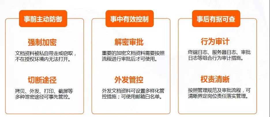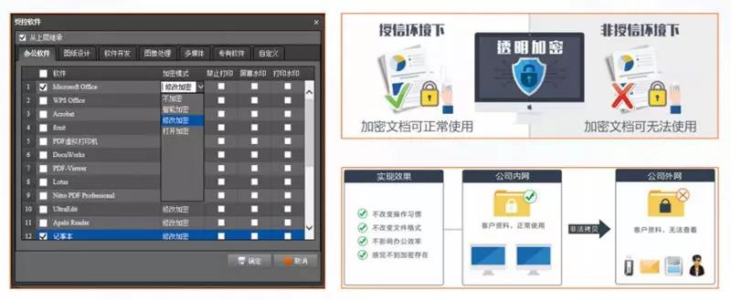 重要數(shù)據(jù)資料在加密基礎(chǔ)上,實現(xiàn)內(nèi)外部數(shù)據(jù)流轉(zhuǎn)管控。核心重要資料的非常規(guī)內(nèi)部使用,必須經(jīng)過解密審批單獨授權(quán)公司外部的流轉(zhuǎn)使用,可通過限定次數(shù)、限定時間限定電腦、限定對象來進行管控。