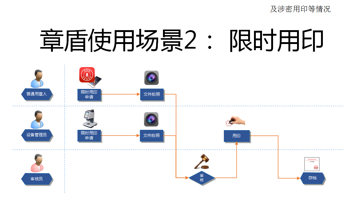 臺式智能印章機章盾適用于總部或大型單位公章,體現(xiàn)為更嚴格的使用要求和實時記錄用章文件和過程,同時也支持外帶使用;便攜式智能印章機信印適用于需要較多外帶使用的業(yè)務部門的業(yè)務用章,配合智能手機使用,體現(xiàn)為更靈活的使用模式和更全面的用印過程記錄。